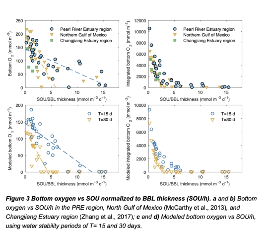 (3)質量平衡模型成功量化缺氧形成時間(圖4b-c),并解釋跨系統差異(如墨西哥灣缺氧時間更長)。