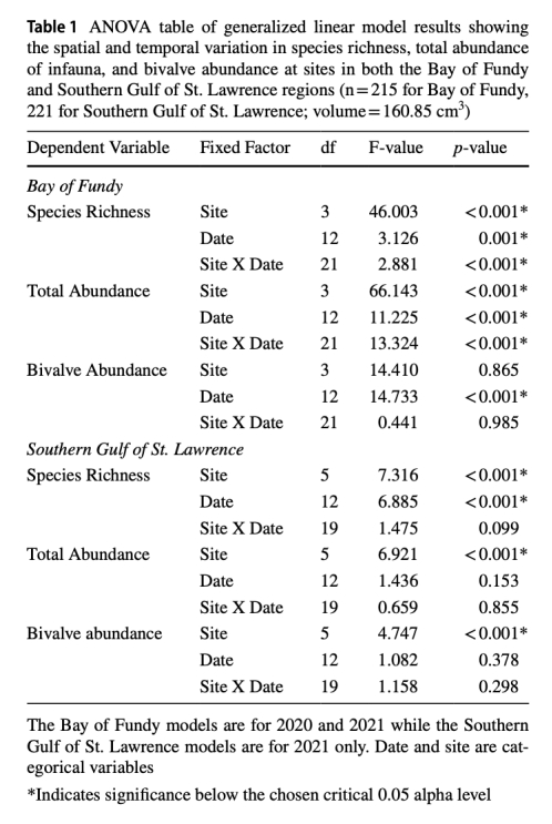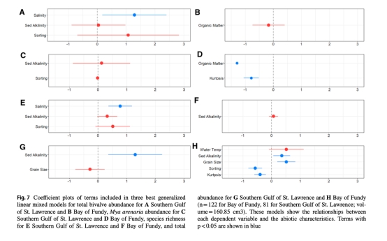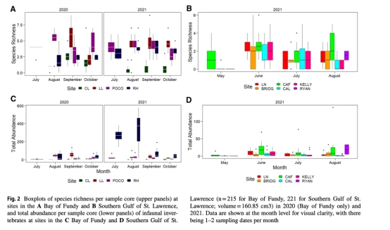 該研究探討了水體(如鹽度、溫度)和沉積物(如粒度、碳酸鹽化學參數)的非生物條件對潮間帶底棲無脊椎動物群落及雙殼類幼體豐度的影響。研究區域位于加拿大新不倫瑞克省的兩個海洋環境差異顯著的區域——芬迪灣(高潮差)和圣勞倫斯灣南部(低潮差)。通過2020-2021年的數據,采用多變量和單變量統計模型分析發現,碳酸鹽化學參數(沉積物pH、水體/沉積物堿度)是解釋底棲群落組成和生物指標(物種豐富度、總豐度、雙殼類豐度)的重要驅動因素。在芬迪灣,沉積物pH解釋了16.9%的群落變異,而在圣勞倫斯灣南部,鹽度是主要驅動因素(9.8%)。研究指出,未來海洋酸化可能通過改變碳酸鹽化學條件(如pH和堿度)顯著影響底棲生物群落。