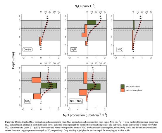 精準定位N2O產消熱點:通過孔隙水剖面(圖2),發現紅樹林沉積物表層0-2 mm存在微弱N2O生產,但整體以深層(>2 mm)的強烈消耗為主,揭示產消過程的垂直分異。