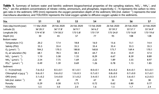 野外采樣:在新西蘭東北部大陸架7個站點采集沉積物和水樣,覆蓋30–128米深度梯度。