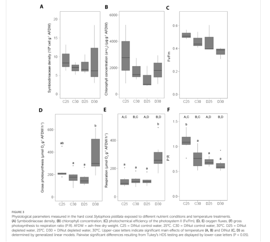 光合與呼吸速率:高溫下軟珊瑚光合作用未下降但呼吸增加,P:R降低(圖2F);石珊瑚在高溫+營養缺乏時P:R最低(圖3F)。