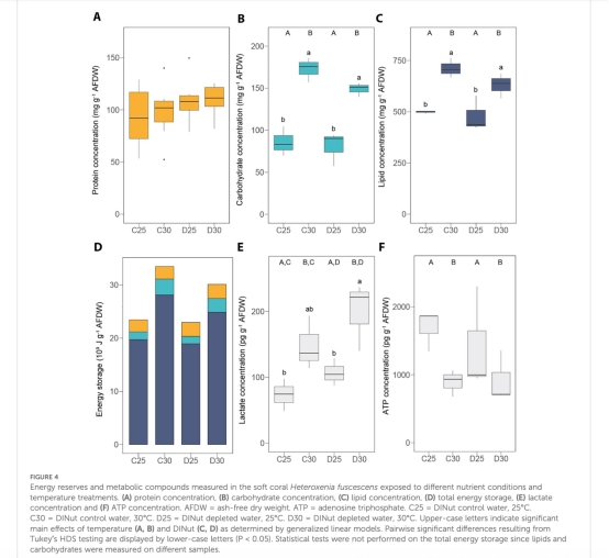 軟珊瑚在高溫下脂質和碳水化合物增加(圖4B-C),但ATP減少41%(圖4F);石珊瑚碳水化合物增加但ATP穩定(圖5B-F)。
