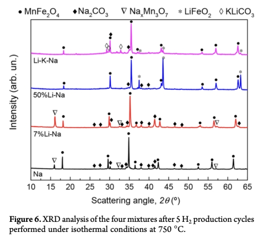 循環(huán)衰減機制:氫氣產(chǎn)量隨循環(huán)次數(shù)驟降(如Na在第五循環(huán)僅產(chǎn)0.01 mmol/g),結(jié)合XRD/SEM數(shù)據(jù),明確燒結(jié)與非化學計量相生成是主因。