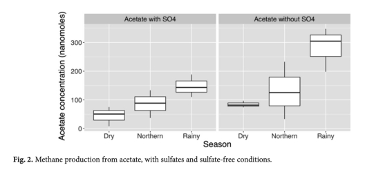 雨季的低鹽度、更負的氧化還原電位(Eh)和更高有機質含量促進了產甲烷作用。