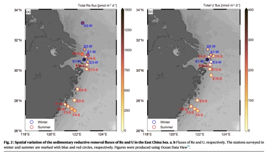 該研究指出錸(Re)和鈾(U)是重建古海洋氧化還原歷史的關鍵指標,但此前研究低估了大陸架沉積物作為其還原匯的作用。通過東海陸架沉積物的224Ra/228Th不平衡方法,發(fā)現Re和U的去除通量與沉積物氧消耗速率、有機碳分解速率呈正相關。全球尺度評估顯示,大陸架沉積物的還原匯規(guī)模與深海缺氧/次氧化匯相當(Re)或更高(U,達4倍),暗示現代海洋Re和U預算可能存在源匯不平衡或現有源項被嚴重低估。