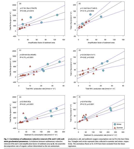 大陸架沉積物Re/U還原去除通量與有機碳分解速率直接相關,冬季強混合促進通量提升3-4倍(表1對比夏冬季數據)。