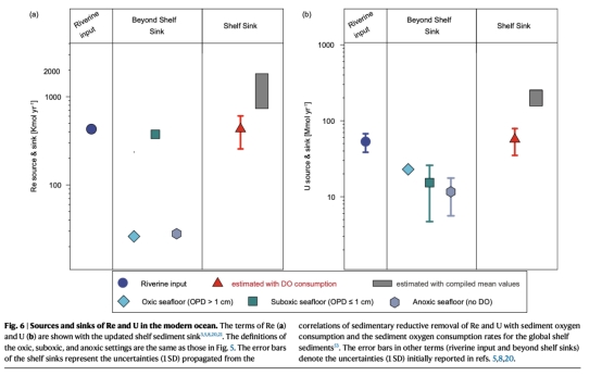 全球陸架Re匯(431±175 Kmol/yr)與河流輸入相當,U匯(57±22 Mmol/yr)超現有深海匯總和(圖6),徹底改變元素預算認知。