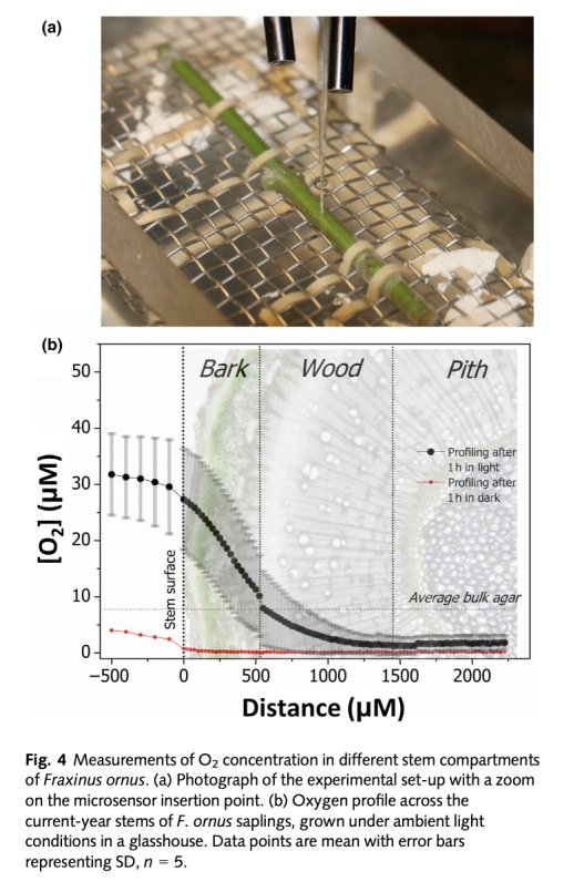 氧氣交換速率測量:利用微傳感器技術測定黑暗和光照條件下莖部整體、樹皮和木材的凈氧氣交換速率(圖2、3)。