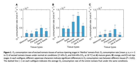 完整果實(shí)的呼吸速率(圖1):測量了不同成熟階段(綠熟、橙熟、紅熟)在不同外部氧氣濃度下的氧氣消耗和二氧化碳生成速率。意義:揭示呼吸速率的階段性變化及其對缺氧的敏感性。