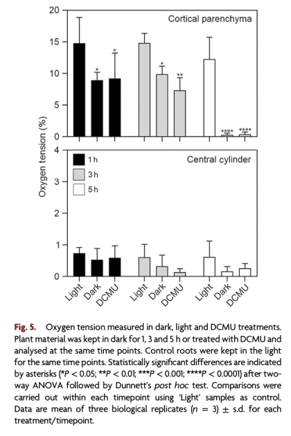 黑暗或抑制光合作用(DCMU處理)導(dǎo)致根部皮層缺氧(氧氣<1%),激活缺氧響應(yīng)基因。
