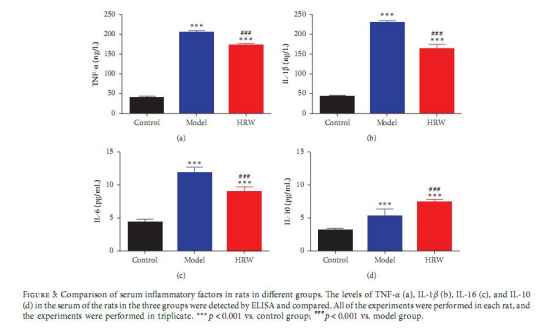 圖3顯示模型組血清TNF-α、IL-1β、IL-6顯著升高,HRW組降低(如TNF-α:模型組約30 ng/mL vs. HRW組約20 ng/mL)。