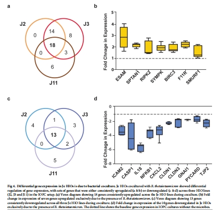 通過(guò)RT2 Profiler PCR陣列分析細(xì)菌共培養(yǎng)后HIOs的轉(zhuǎn)錄組變化(圖4)。