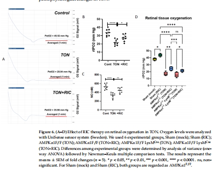 總結:該研究闡明RIC通過骨髓AMPKα1依賴的抗炎信號和AMPKα1獨立的血管舒張雙途徑保護TON損傷,為臨床轉化提供了堅實的分子機制基礎。Unisense電極數據揭示了RIC改善視網膜缺氧的直接效應,是其神經保護的重要環節。