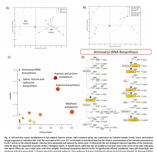 黏液代謝組 鰓vs皮膚:高濃度組25種代謝物差異;氨基酸t(yī)RNA合成通路顯著富集(圖4C-D)。 圖4 反映鰓黏膜代謝重編程(氨基酸合成增強),支持能量需求增加。