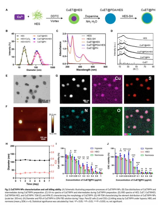納米顆粒表征(圖2B-G 如下):尺寸(122 nm)、電位(-10.8 mV)、元素分布及穩(wěn)定性,證明CuET@PH NPs適合系統(tǒng)給藥。