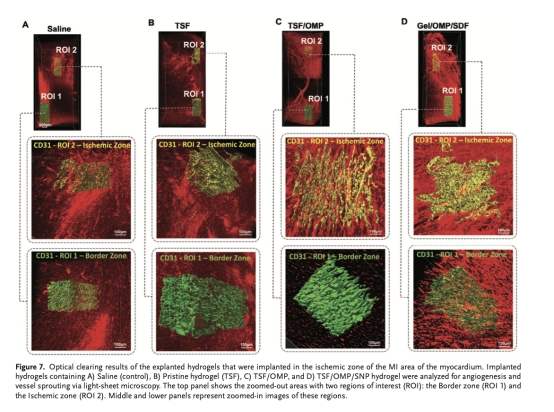 三維血管網絡(圖7):光片顯微鏡顯示TSF/OMP/SDF組血管分支增多、結構有序。意義:直觀驗證血管新生效果。