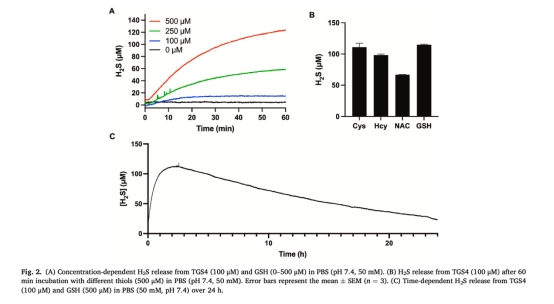 精確動力學解析:揭示TGS4的H?S釋放具有"緩釋"特性(持續>2小時),區別于傳統快速釋放型供體,更貼近生理性H?S生成模式。