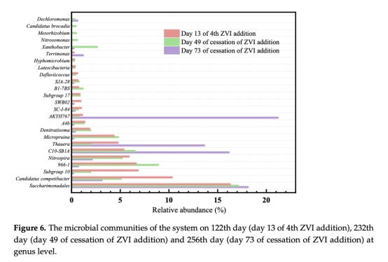 微生物影響:ZVI促進Nitrospira sp.(NOBs)和Saccharimonadales sp.豐度,但長期抑制PAOs(圖6)。