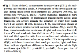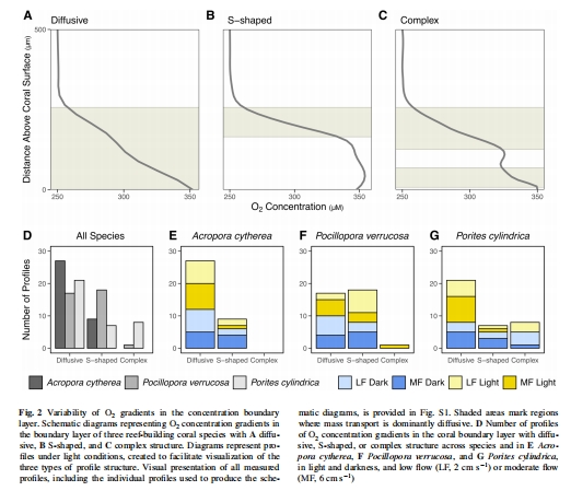 論文通過微傳感器技術測量了三種小型息肉分枝狀珊瑚(Acropora cytherea、Pocillopora verrucosa、Porites cylindrica)的溶解氧濃度邊界層(CBL)特性(厚度、表面氧濃度、氧通量),探究其在光照/黑暗和低/中水流(2 cm/s vs 6 cm/s)條件下的變異性。研究發現: