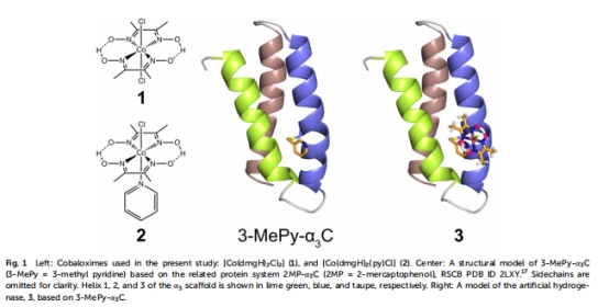 研究對象:基于全新設計的三α螺旋蛋白(a3C)和鈷基催化劑(鈷肟,cobaloxime)構建的人工酶。