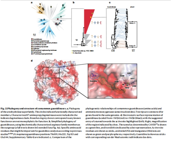 機(jī)制:通過蛋白組學(xué)(Extended Data Fig. 4b)、酶動(dòng)力學(xué)(圖4a)和晶體結(jié)構(gòu)(圖2d)證明其胍酶(guanidinase)功能;胍代謝受胍-I型核糖開關(guān)調(diào)控(圖1c)。
