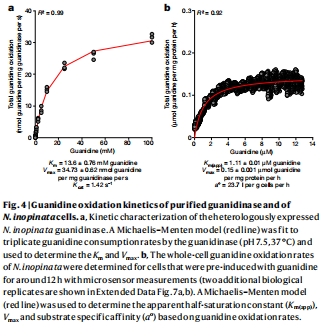 胍降解動(dòng)力學(xué) 圖4a(酶動(dòng)力學(xué))、圖4b(全細(xì)胞) 揭示胍酶高催化效率(Km=13.6 mM),但全細(xì)胞胍氧化親和力極高(Km(app)=1.34 μM),說明細(xì)胞高效攝取胍(Extended Data Table 1)。