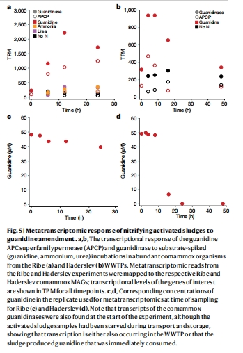 污水廠轉(zhuǎn)錄組 圖5a,b(胍酶基因TPM值) 胍添加后comammox胍酶和轉(zhuǎn)運(yùn)蛋白基因表達(dá)上調(diào)2.6倍(Padj<10-8),證實(shí)環(huán)境中的功能活性。