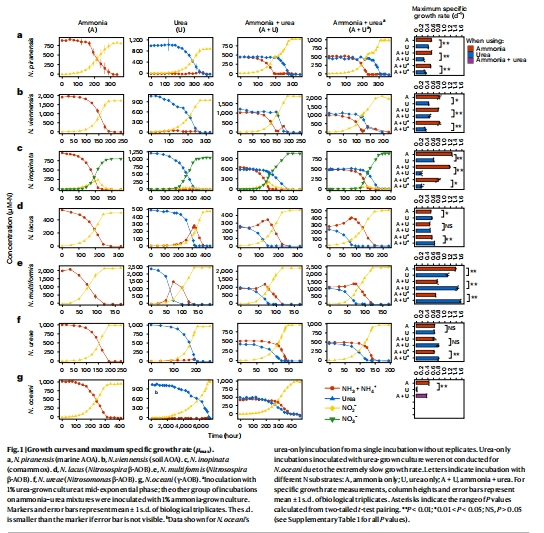 AOA(N. piranensis, N. viennensis)和comammox(N. inopinata)先耗盡氨后才利用尿素(存在雙峰生長)。