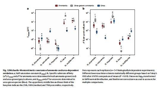 數據:微呼吸儀(Unisense電極)測定氨/尿素氧化的米氏常數(Km(app))和比親和力(a°)。