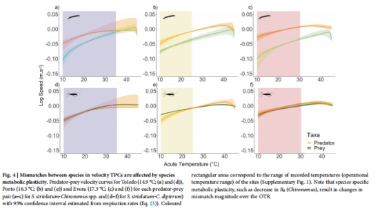 論文揭示了代謝可塑性(metabolic plasticity)如何通過改變捕食者與獵物的生理性狀匹配度,進而影響二者在氣候變暖下的相互作用。通過測量三種水生昆蟲幼蟲在自然溫度梯度下的呼吸速率,結合機制模型預測發現: