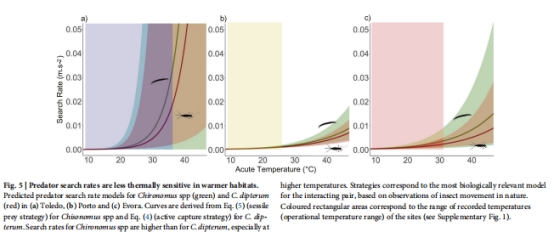 蜻蜓-搖蚊組合:變暖加劇運動速度錯配 → 蜻蜓搜索率顯著升高(圖5),搖蚊被捕食風險增加;