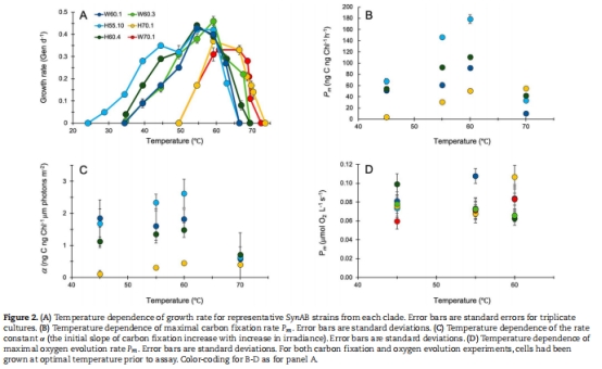 與碳固定數據(Fig. 2B, C)對比:高溫菌株碳固定能力顯著下降,但放氧能力穩(wěn)定。