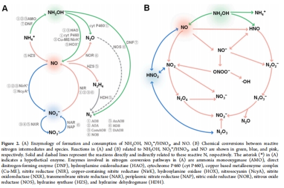 酶學(xué)層面:解析微生物(AOB、AOA、AnAOB等)中RNI的酶催化路徑(圖2A)。
