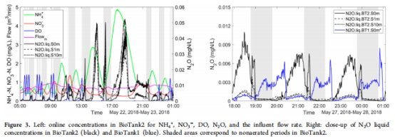 1分鐘分辨率揭示相控工藝的瞬態(tài)特征(圖3右):停曝后N?O因持續(xù)產(chǎn)生且剝離減少而驟升,為機(jī)制解析提供關(guān)鍵證據(jù)。