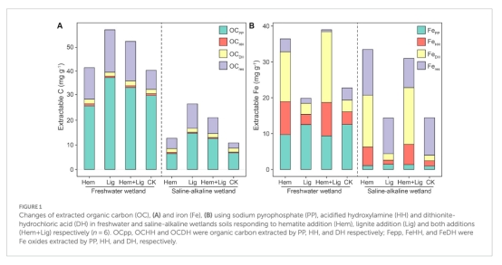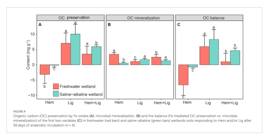 摘要指出:鐵氧化物(Fe)可通過吸附和共沉淀穩(wěn)定有機(jī)碳(OC),但微生物鐵還原會(huì)破壞鐵結(jié)合有機(jī)碳(Fe-OC)并促進(jìn)OC礦化。本研究通過向淡水和鹽堿濕地土壤中添加結(jié)晶鐵氧化物(赤鐵礦,Hem)和老舊碳(褐煤,Lig),探究兩者對OC平衡的影響。結(jié)果顯示: