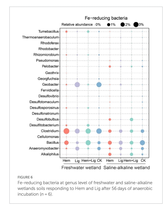 調(diào)控微生物活性:pH強(qiáng)烈影響鐵還原菌(如地桿菌屬)的代謝活性(最適pH 6.7–7.0)。本研究中Hem和Lig添加后pH降低(FW初始pH 6.54),抑制了鐵呼吸菌活性(圖6),解釋了Fe(II)產(chǎn)量下降現(xiàn)象(圖3A)。