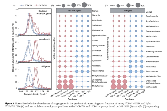 DNA-SIP微生物群落(圖3):重密度同位素標記組分中Methylocystis、Methylophilaceae等富集,確認其參與甲烷氧化和固氮。
