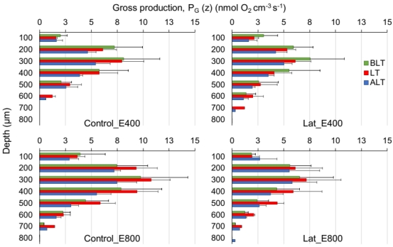 意義:直接量化光合活性層動態,揭示硅藻遷移如何優化光捕獲(LT時O?峰值升至600 μmol L?1)。Lat-A抑制遷移后,光合層加深(圖4),證明運動影響光合位點選擇。