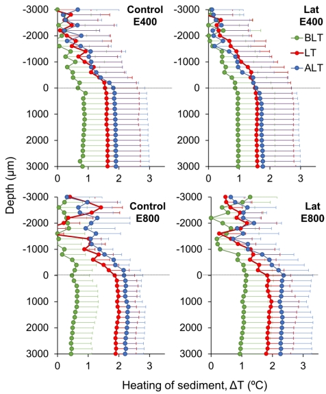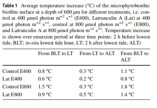 論文通過微傳感器(溫度、O?)、反射光譜和葉綠素熒光測量,研究了潮間帶底棲硅藻生物膜的輻射能量收支(REB)。實驗對比了自然遷移組(Control)與運動抑制組(Latrunculin A處理)在不同暴露時間(1 h、3 h、5 h)和光照強度(400/800 μmol photons m?2 s?1)下的能量分配。結果表明: