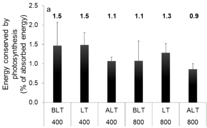 反射光能恒定(~23%入射光),大部分光能(76–78%)以熱能耗散,光合轉化效率僅占0.5–1.2%。
