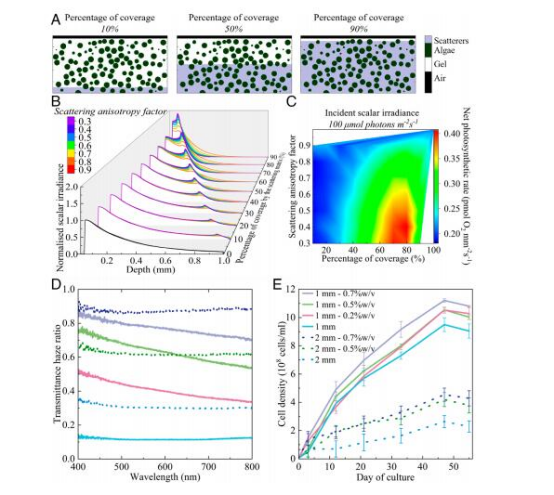 通過蒙特卡洛模擬和實驗驗證(積分球透射率測量、共聚焦顯微鏡聚集體分析),證明異質聚集體分布比均質生物膜更有效提升光合效率。