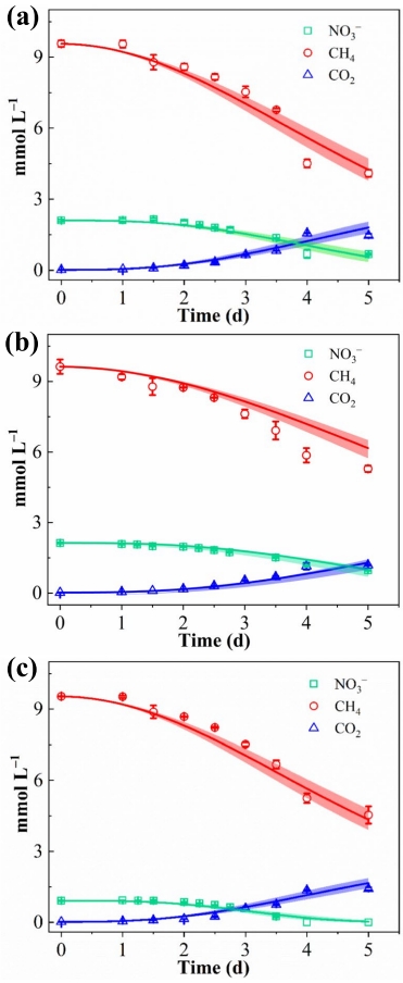 圖7模型擬合動力學曲線:(a) 2 mM硝酸鹽/75%空氣,(b) 2 mM硝酸鹽/40%空氣,(c) 0.9 mM硝酸鹽/75%空氣。陰影區域表示采用卡方檢驗在參數置信限極值處的95%推斷置信區間。微生物硝酸鹽同化伴隨CH4氧化的動力學模型是基于(2 mM硝酸鹽/75%空氣)(a)的實驗數據建立的。通過(2 mM硝酸鹽/30%空氣)(b)和(0.9 mM硝酸鹽/75%空氣)(c)條件下的實驗對模型準確性進行了評估。