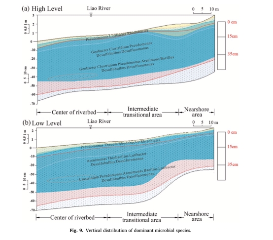 深層沉積物中鐵錳/硫酸鹽還原菌(如Thiobacillus, Desulfuromonas)共存(圖9,12),反映氧化還原帶重疊的微生物證據。