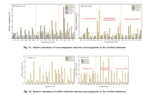 功能菌豐度(圖10-12):反硝化菌(Pseudomonas)在近岸區枯水期增加,鐵錳還原菌(Geobacter)在河心區減少。
