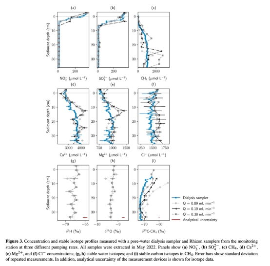 該研究評估了不同抽水速率對潛流帶(HZ)孔隙水采樣的影響,重點關注離子、穩定同位素和氣體(如CH?)濃度的測量準確性。研究結合Rhizon采樣器、自制光纖氧傳感器和溫度監測系統,在德國Moosach河細粒沉積物區域進行原位實驗。結果表明: