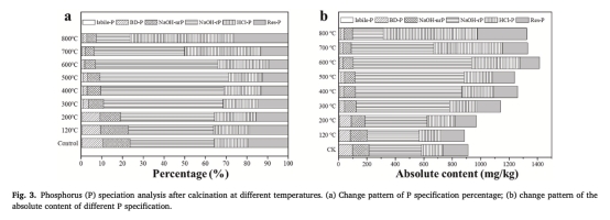 磷形態轉化:煅燒將活性磷(Labile-P、BD-P、NaOH-nrP)轉化為穩定形態(Al-P、Ca-P、Res-P),700°C時惰性磷占比超90%(圖3)。