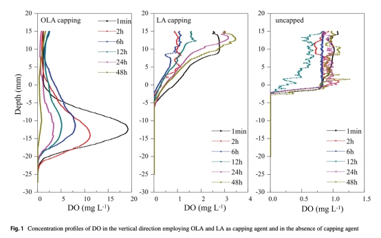 快速增氧效果:OLA覆蓋后1分鐘內沉積物DO濃度峰值達19.5 mg/L(10-15mm深度),穿透深度22.5mm(圖1),維持高氧狀態48小時。