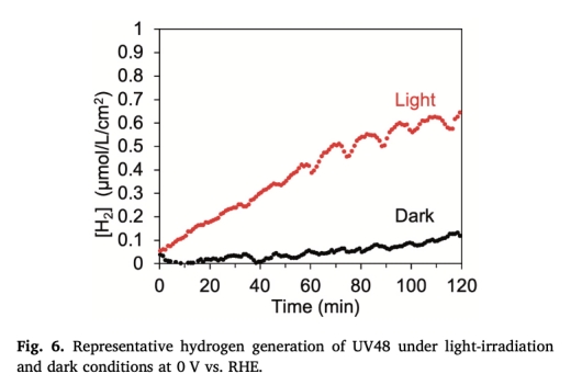 數據:UV48產氫速率0.63 μmol/cm2/天(0 V vs. RHE),法拉第效率0.09-0.41%(0 V) vs. 48.1-77.6%(-0.69 V)。