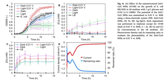 數據:無電位時Cu2?溶出0.38-0.47 mM(抑制大腸桿菌生長54-58%);維持0.01 V vs. RHE電位可完全抑制Cu2?溶出。
