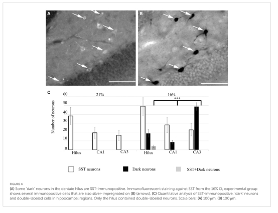 結(jié)構(gòu)損傷:Gallyas銀染法顯示缺氧導致海馬門區(qū)(hilus)生長抑素(SST)陽性抑制性神經(jīng)元出現(xiàn)“暗神經(jīng)元”(退化早期標志),CA3區(qū)損傷最顯著(圖2-3)。